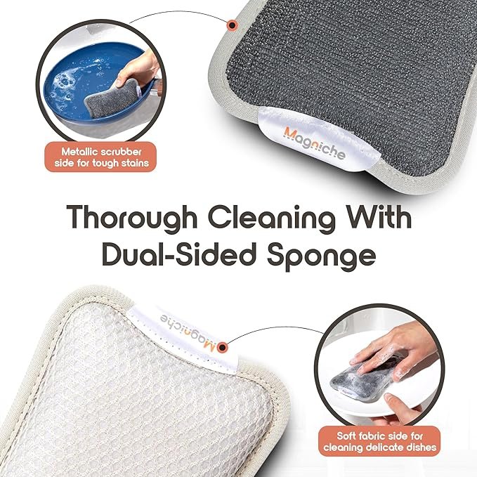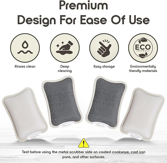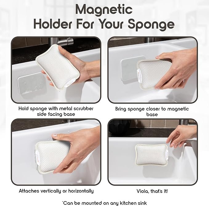 Premium Magnetic Dish Sponge System- 3-in-1 Design – Dual Sided Soft Kitchen Sponge + Metal Scrubber + Magnetic Sponge Holder, Dishwasher Safe, 1-Year Supply, Combo (4 Sponges + 2 Magnetic Holders)